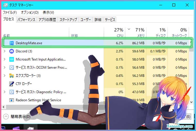 ウィンドウの上に置くと、そのウィンドウが別ウィンドウの下に行ったときに少し不自然な動作になるため、基本的にタスクバーの上に座らせることにしている。無料キャラクターだとボイスも無いが、有料のキャラクターであればボイスやモーションが増えるようで、そこも楽しみがある。